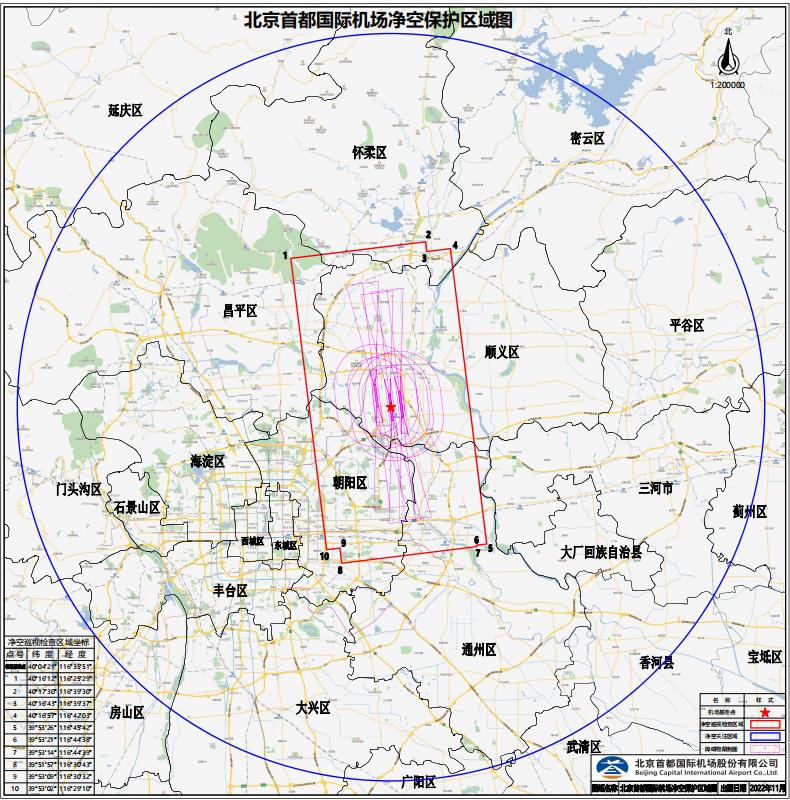 首都機場凈空保護區域范圍為以首都機場基準點為圓心、水平半徑55公里的空間區域。見圖1藍色圓形區域。