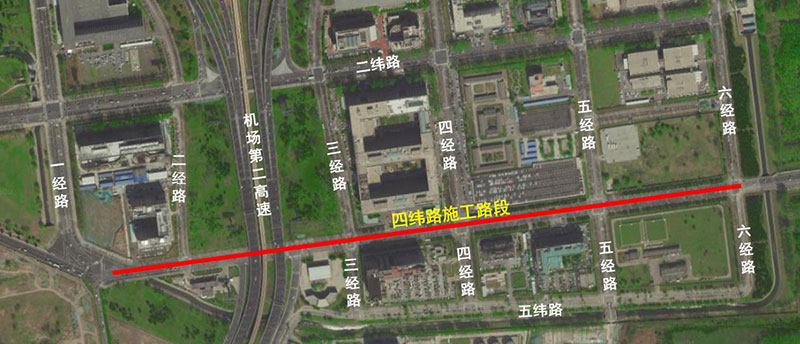 首都機場四緯路位于3號航站樓南側工作區,呈東西走向,施工范圍為一經路至六經路,路段全長1091米。屆時將采取交通管理措施如下: