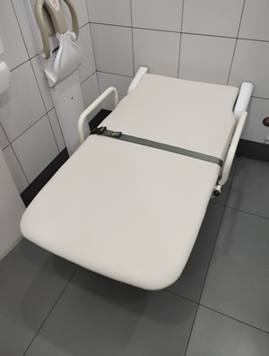 在2號航站樓出發(fā)層北側(cè)無障礙衛(wèi)生間內(nèi),設(shè)置了無障礙護理床。輪椅旅客、老年旅客、病人及護理人員可以使用護理床,更換整潔的衣物、紙尿褲、導(dǎo)尿等。