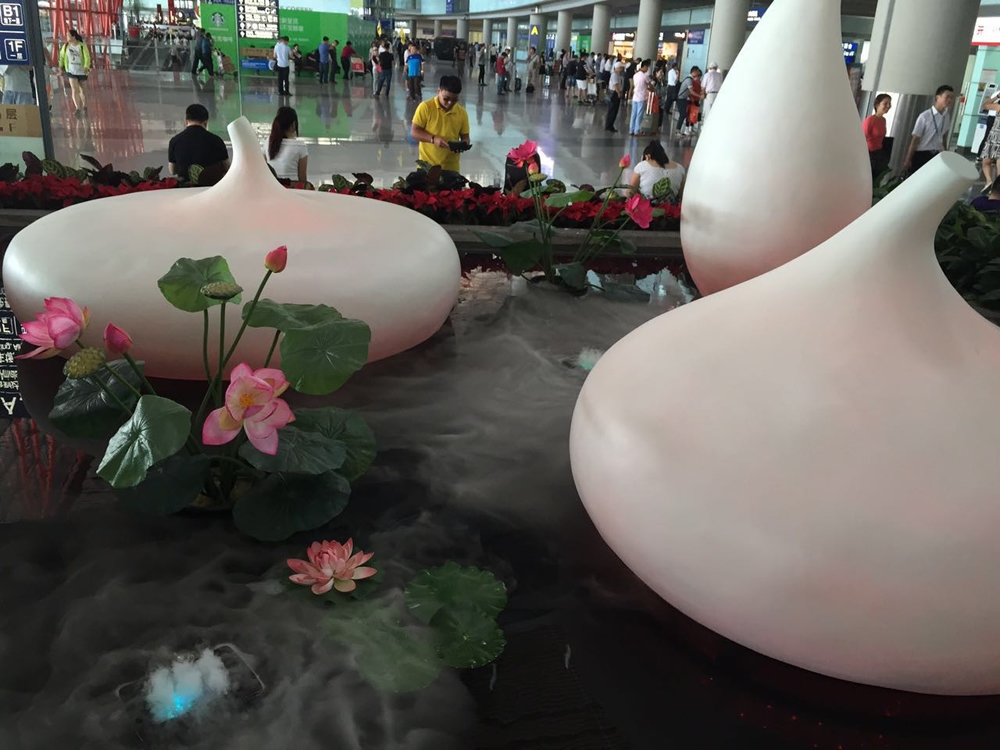 T3C二層進港東西兩側各有一處清新舒適且現代美觀的“小綠洲”景觀。由“水滴”提煉出來的造型,現代而簡約,形態優美,象征著清新自然、生生不息的美好寓意。東邊名為《曲苑風荷》,以水滴造型設計的小品配合流水,通過燈光和色彩的處理,使小品如同身姿曼妙的舞者,美輪美奐。西邊名為《高山流水》,以秀竹為背景,將小品和流水形象地表現為潺潺流水和巍巍高山相映成趣的意境,仿佛山巒起伏的遠景就呈現在面前。