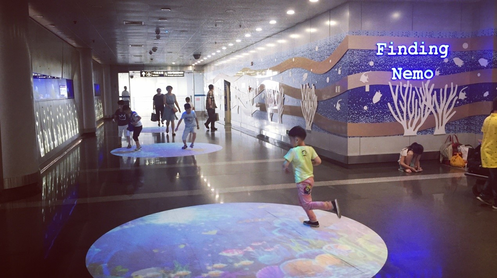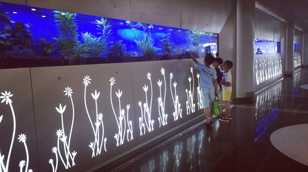 T2連廊口設置了集“水族觀賞、合影留念、投影互動”于一體的T2“海底世界”景觀走廊,新加入的投影互動系統,將T2“海底世界”的動態影像投影于地面,在紅外系統的監控下,旅客腳步踩過“水面”,游魚會“匆匆”游走,不經意間的高科技互動體驗,為旅客帶來了意外的歡樂。