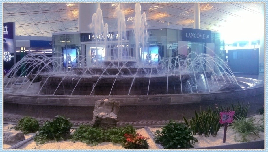 T3E免稅區的中央景觀設計了《御泉垂虹》噴泉。它的造型借鑒了萬園之園的圓明園“大水法”,它豐富多彩的噴水形式和色彩把航站樓2公里的軸線裝點得色彩斑斕。在水池的東(青龍)、南(朱雀)、西(白虎)、北(玄武)有四個震水獸,保四方風調雨順、九洲平安。