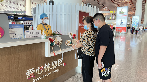 暑運期間,隨著老年旅客和兒童旅客的增加,首都機場航站樓暖陽團隊在每個柜臺配備了飲用水、藿香正氣水、風油精、十滴水等清涼解暑物品,供有需要的旅客使用。同時,團隊成員充分發揮自己的想象力和主動性,DIY 出獨具特色的團扇,贈送給前來愛心休息區休息的老年旅客,得到了旅客們的一致好評:“扇子非常精美,也很有意義。在疫情這個特殊時期也能感受到來自首都機場的濃濃的關愛,在這炎炎夏季讓我們感受到了絲絲清涼”。