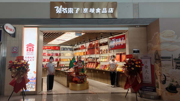 為更好推廣“禮贊國門”服務(wù)產(chǎn)品,近日,以“兔爺來了”命名的京味食品店亮相首都機(jī)場(chǎng)3號(hào)航站樓四層出發(fā)層?xùn)|側(cè),主要經(jīng)營京味特色食品,相關(guān)產(chǎn)品包含張一元、御食園、御茶膳房、天福號(hào)等多個(gè)知名品牌。