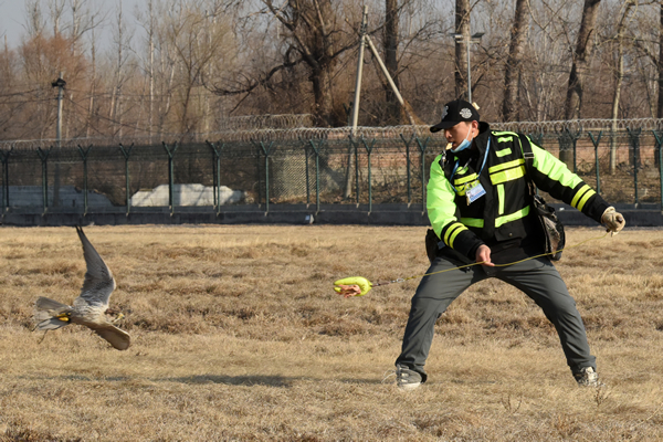 其中,針對機警的集群小型鳥類,首都機場在跑滑區域鳥網桿頂部增加了泛光飄帶、彩色風輪等視覺設備進行干擾,同時組織人工驅鳥隊伍采取視覺、聽覺震懾驅趕等措施,避免鳥類逗留。而針對大型猛禽,首都機場則采用獵鷹驅鳥為主、“土方”捕捉為輔的方式,鷹舍獵鷹“傾巢而出”,“絆腳籠、鷹叉、鴿衣”等各種民間驅鳥方式各顯神通,收到了良好效果。